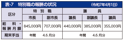 市議会議員の報酬や市長などの特別職の給料は、市内各団体などの代表者からなる特別職報酬等審議会の答申を受け、市議会の議決を経て条例で定められており、現在の状況は表7となっています。
