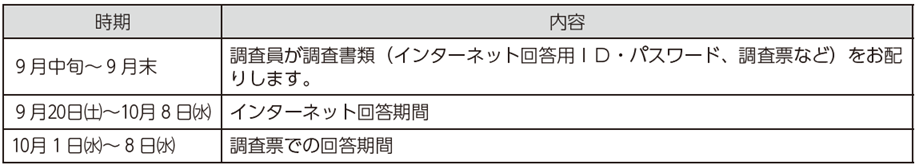 9月中旬から各世帯に調査書類を配付します。漏れや重複なく調査を行うために、訪問時に世帯の代表者の氏名、世帯の男女の人数をお伺いします。