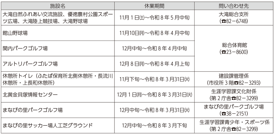 くらし 市内の公共施設 冬季休業のお知らせ 12/35 前の記事 次の記事 発行日 : 2025年11月01日 自治体名 : 北海道伊達市 広報紙名 : 広報だて 2025年11月号 次の施設を冬の間、休業します。期間中はご不便をおかけしますが、ご理解とご協力をお願いします。 ※施設の休業期間は天候や積雪などの影響で変更する場合があります Tweet シェアする 冬期間の「通行止め」と「雪捨て場」のお知らせ 暮らしの情報ひろば(1)