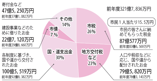 1万円未満は省略しています。「市民1人当たり(の金額)」は、それぞれの額をかっこ内の人口で割っています。(令和7年3月31日現在の人口5万6323人)