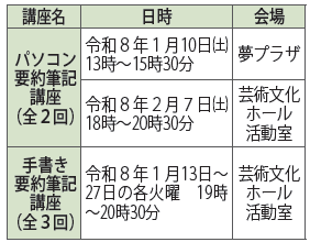 講座 要約筆記講座(パソコン・手書き) 26/45 前の記事 次の記事 発行日 : 2025年12月01日 自治体名 : 北海道北広島市 広報紙名 : 広報北広島 2025年12月1日号 パソコンや手書きで要約筆記をする基本的技術を学びませんか。 対象:耳が不自由な方への理解があり、筆記通訳に関心がある方 申込み:福祉課(【電話】内線2137) Tweet シェアする ぽると就労準備支援事業 12月3日(水)~9日(火)は障がい者週間