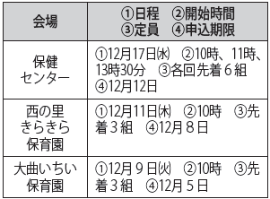 ・新規の方…申込書と必要書類を持ち、保育所等=子ども家庭課(【電話】内線2206)、学童クラブ=子ども家庭課(【電話】内線2204)か西部・大曲・西の里出張所