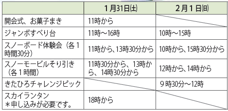 ジャンボすべり台やスノーボード体験などのほか、キッチンカーやテントで飲食物の販売を予定しています。初日の夜には、220220基のスカイランタンを夜空に飛ばします。