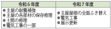 昭和59年の保存修理工事から30年以上がたち、老朽化が進んできたため、令和6年度から耐震補強・保存修理工事を行っています。屋根のふき替えが終わり、来年度のリニューアルオープンに向けて展示物の更新を進めています。