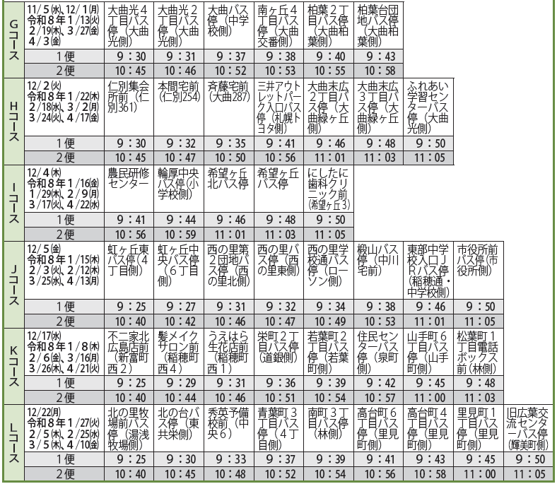 *竹山高原温泉は改修工事で一時閉館中のため、例年運行している温泉行きバスA~Fコースは、11月~令和8年4月は運行しません。