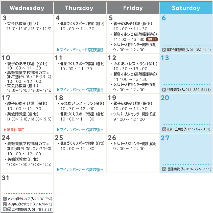 ※岩見沢市の緊急当番医は岩見沢医師会のHP、または新篠津消防署、役場(当直)まで直接ご確認ください。