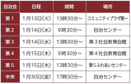 令和7年度の自治懇談会を下記の日程で開催する予定です。悪天候が予想される場合は、日程変更となることがありますのでご了承ください。なお、変更の場合は防災無線などでお知らせします。