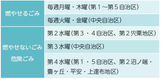 10月6日(月)より、可燃ごみ・不燃ごみの収集日が以下の通り変更になります。なお、資源ごみの回収については、曜日の変更はありません。