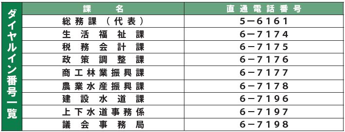役場の代表番号【電話】5-6161も引き続き利用可能のため、担当課が分からない等の場合は代表番号に電話していただきますようお願いします。
