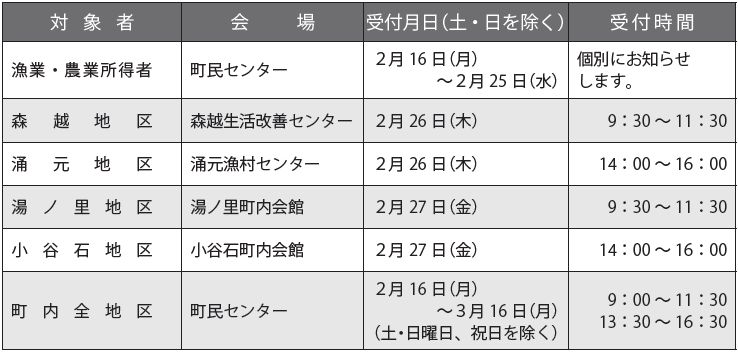 町では、令和7年分所得税及び復興特別所得税と令和8年度分住民税の確定申告の受付を、2月16日(月)から3月16日(月)までの期間で、下記日程表のとおり行います。