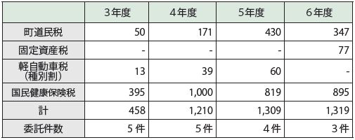 当町においては、滞納額は着実に減少していますが、委託件数は横ばい(下表参照)となっているので今後も機構と連携し、積極的に滞納整理を進めていきます。納期内納税を心がけましょう!