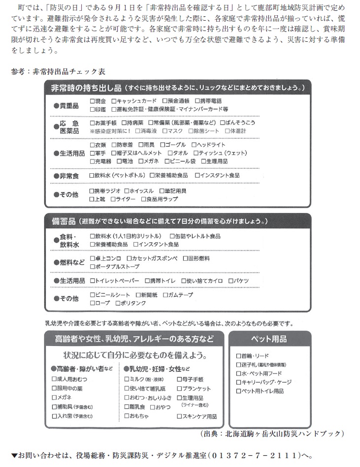 くらし 9月1日は防災の日です 12/31 前の記事 次の記事 発行日 : 2025年09月01日 自治体名 : 北海道鹿部町 広報紙名 : 広報しかべ 2025年9月号 非常時の持出品を確認しましょう Tweet シェアする 令和7年度鹿部町健康づくり事業のお知らせ 空き家・空き地を有効活用しましょう