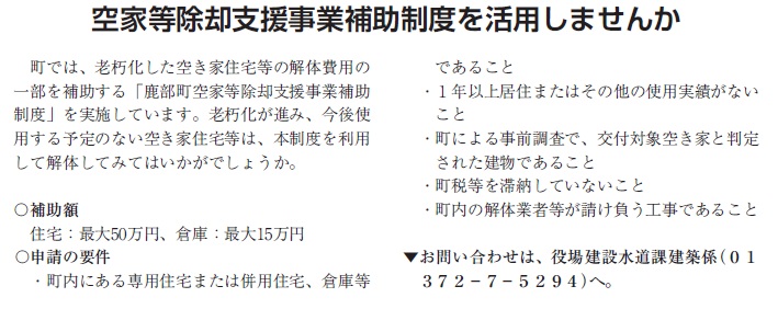くらし 町が解体費用をサポートします 14/31 前の記事 次の記事 発行日 : 2025年09月01日 自治体名 : 北海道鹿部町 広報紙名 : 広報しかべ 2025年9月号 Tweet シェアする 空き家・空き地を有効活用しましょう 『語らい町長室』について