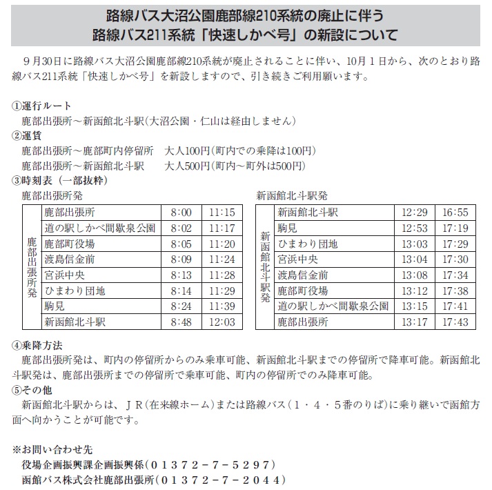 くらし 路線バス211系統「快速しかべ号」の新設について 21/31 前の記事 次の記事 発行日 : 2025年09月01日 自治体名 : 北海道鹿部町 広報紙名 : 広報しかべ 2025年9月号 Tweet シェアする 路線バス鹿部駅線222系統(しかバス)の運行内容変更について 第49回鹿部町文化祭 出展and出演者募集