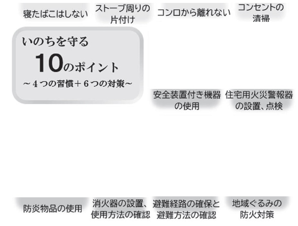 消防では、住宅火災を予防し被害の軽減を図るため「住宅防火 いのちを守る 10のポイント」を推奨しています。