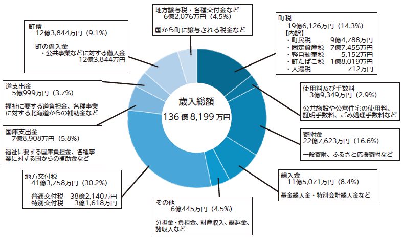 歳入総額に対して、町税は19億6,126万円で、歳入全体に占める割合は14.3%となっております。ふるさと応援寄附金は22億7,231万円で、前年度と比較し4億1,768万円の減少となっております。