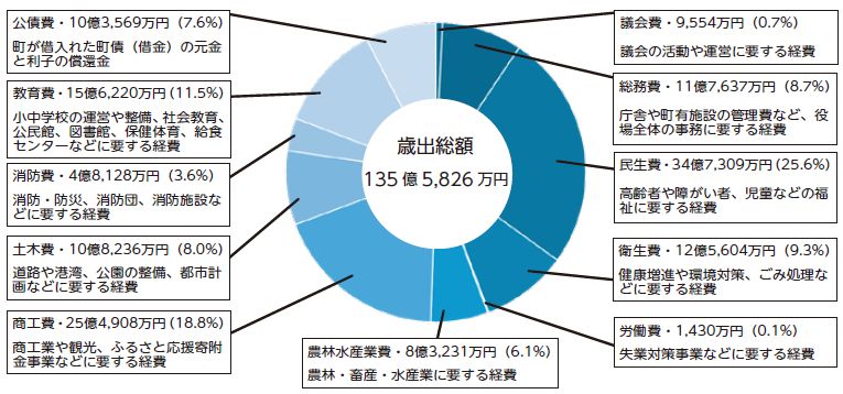 歳出を目的別で見ると、福祉関係の経費である民生費が34億7,309万円で25.6%を占め最も多くなっており、次いで、ふるさと応援寄附金関係の経費を含む商工費が25億4,908万円で18.8%を占めています。また、町が過去に借入れた町債(借金)の償還金である公債費が10億3,569万円で、歳出全体の7.6%となっています。