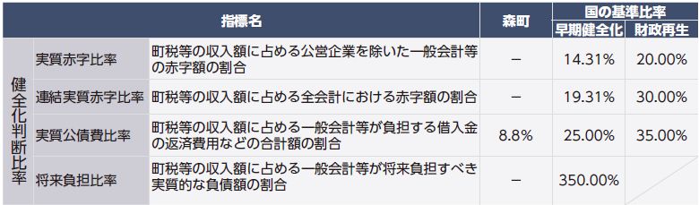 森町の令和6年度決算における「健全化判断比率」および「資金不足比率」の算定結果は、次のとおりです。