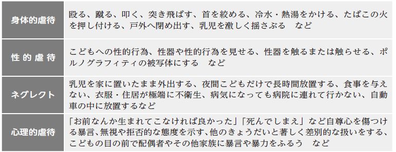 こどもの虐待とは、保護者(親または養育者)が、こどもの心や体を傷つけ、こどもの健やかな発育や発達に悪い影響を与えることをいい、以下の4種類に分類されます。