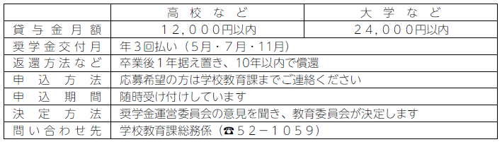 教育委員会では、経済的理由などにより高校などでの学びが困難な方(保護者が町内在住)に対し、学費の一部を無利子で貸与しています。