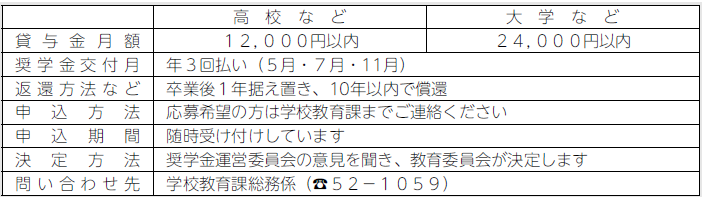 教育委員会では、経済的理由などにより高校などでの学びが困難な方(保護者が町内在住)に対し、学費の一部を無利子で貸与しています。