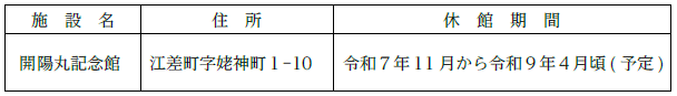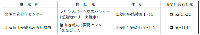 新道の駅建設に伴い開陽丸青少年センター管理棟解体工事が行われるため、令和7年11月から次のとおり移転・休館します。ご不便をおかけしますが、ご理解のほどよろしくお願いします。