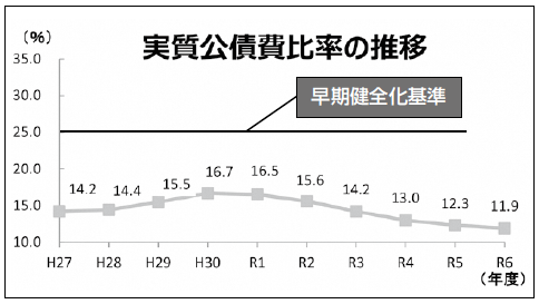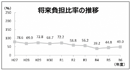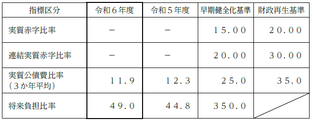 令和6年度決算に基づく比率等を見ますと、いずれも国の定める基準を下回り財政の健全性を保っていますが、実質公債費比率減少の一方、将来負担比率は増加となりました。