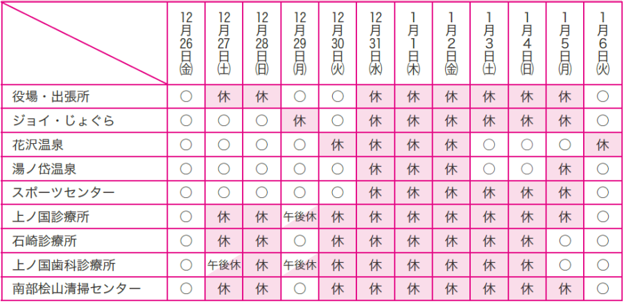くらし 年末年始の休館・休診について 31/33 前の記事 次の記事 発行日 : 2026年01月01日 自治体名 : 北海道上ノ国町 広報紙名 : 広報かみのくに 令和8年1月号(No.773) Tweet シェアする 日曜祝日の当番医 カミGO!上ノ国町デマンド交通