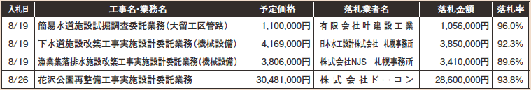 ・金額はすべて消費税および地方消費税相当額を含んだ額です。なお、予定価格を公表しない指名競争入札は落札率を記載しておりません。(落札率の記載がある場合、小数点第1位未満を四捨五入して掲載しています。)
