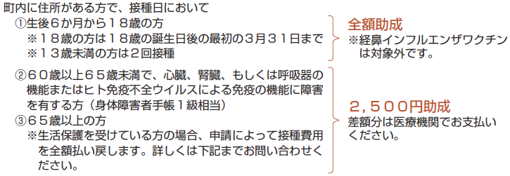町では、インフルエンザワクチンの予防接種を希望する子どもと高齢者に対して、インフルエンザのまん延や重症化予防のため、予防接種の費用を助成しています。