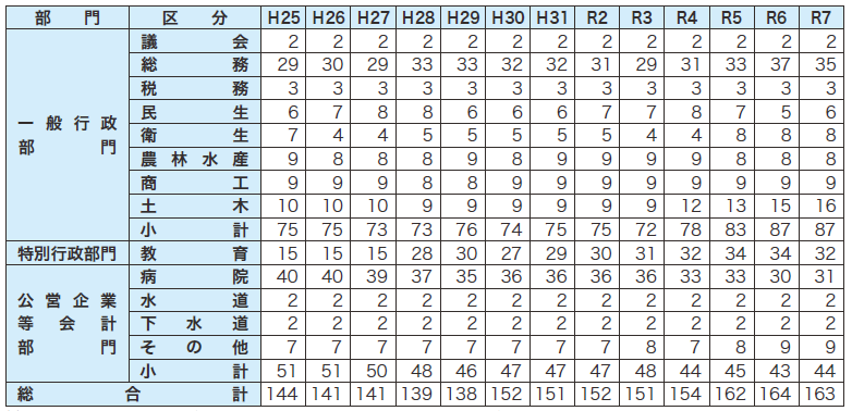 2 総務…バス、自動車整備工場職員を含む。農林水産…あわび種苗育成センター職員を含む。商工…発電課職員を含む。土木…空港管理事務職員含む。その他…国保事業会計、介護保険事業会計、介護サービス事業会計職員など。