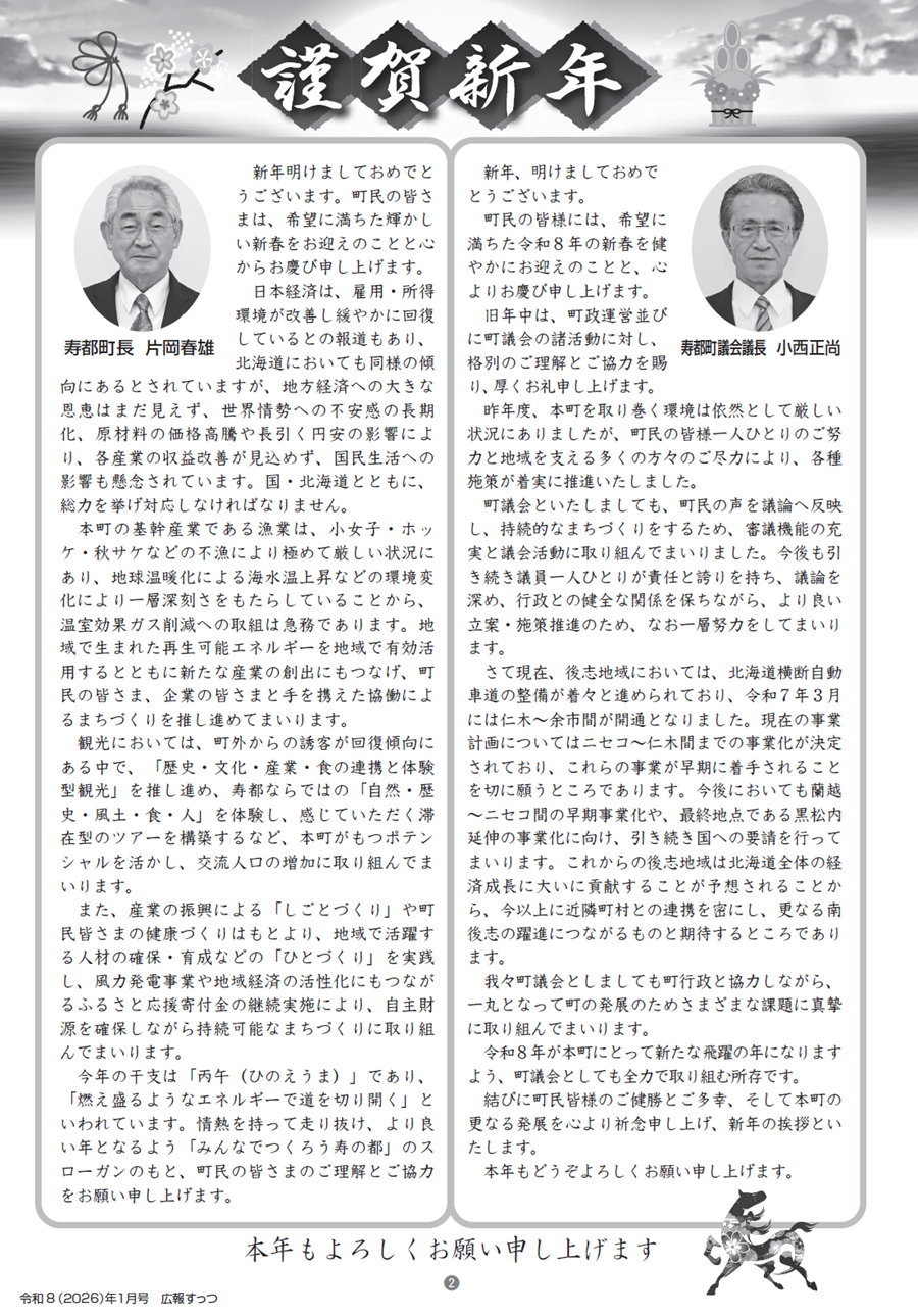 くらし 広報すっつ 2026年1月号 P.2 2/10 前の記事 次の記事 発行日 : 2026年01月07日 自治体名 : 北海道寿都町 広報紙名 : 広報すっつ 2026年1月号 Tweet シェアする 広報すっつ 2026年1月号 表紙 広報すっつ 2026年1月号 P.3