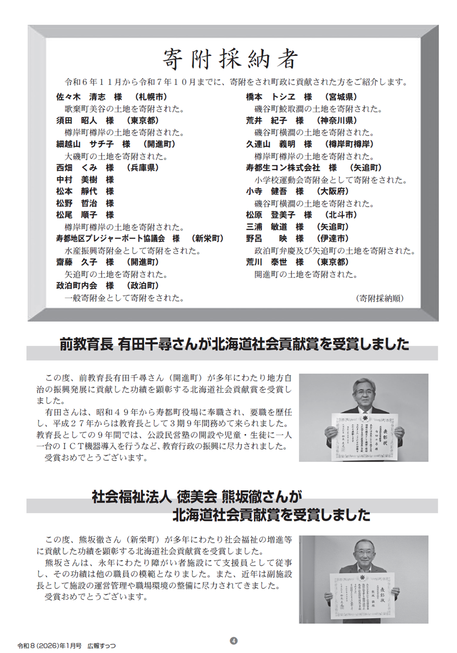くらし 広報すっつ 2026年1月号 P.4 4/10 前の記事 次の記事 発行日 : 2026年01月07日 自治体名 : 北海道寿都町 広報紙名 : 広報すっつ 2026年1月号 Tweet シェアする 広報すっつ 2026年1月号 P.3 広報すっつ 2026年1月号 P.5