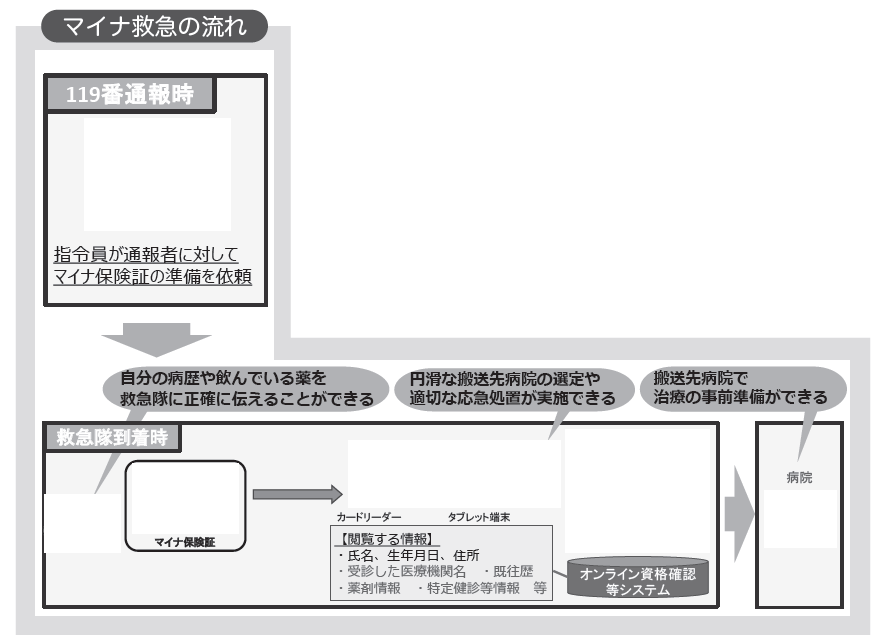 マイナ保険証を活用して得られた情報から迅速かつ安心、安全な救急医療サービスの提供を目的として効果が得られることが期待されています。