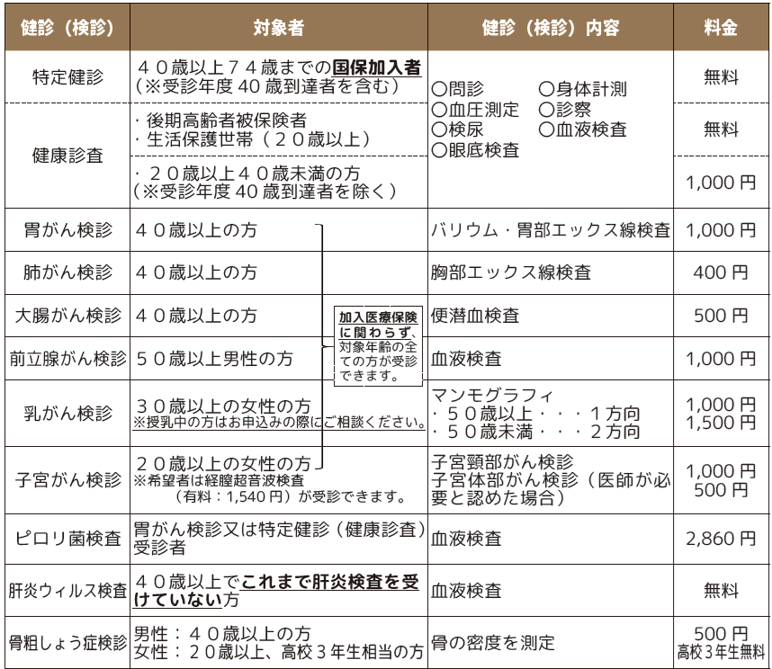 ※令和7年4月1日現在70歳以上の方、生活保護の方は無料です。(経膣超音波、ピロリ菌検査は料金がかかります)