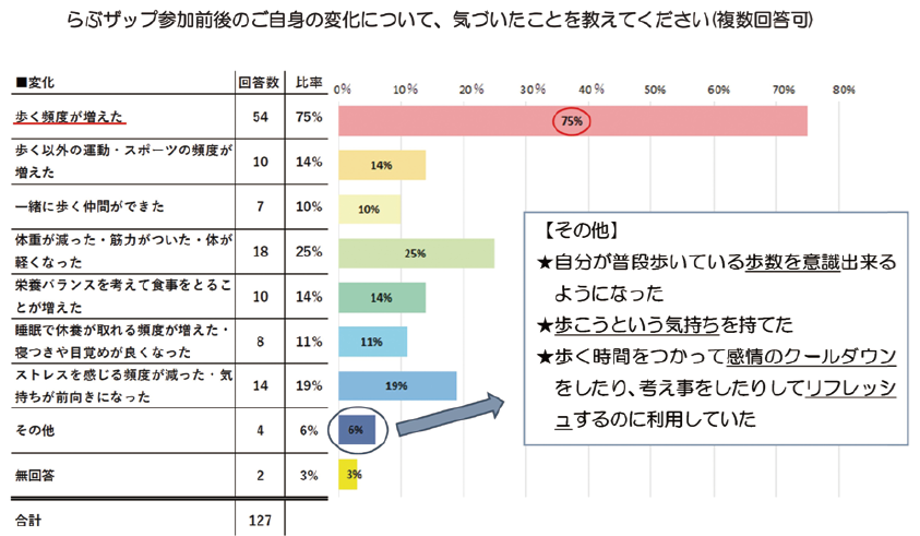 アンケート提出者のうち75%の方が、参加後「歩く頻度が増えた」と回答されました。また、「その他」の回答を詳しく見てみると、歩くことへの意識づけにつながったという方や、歩く時間を気持ちの整理やリフレッシュに活用していたという方もいらっしゃったようです!