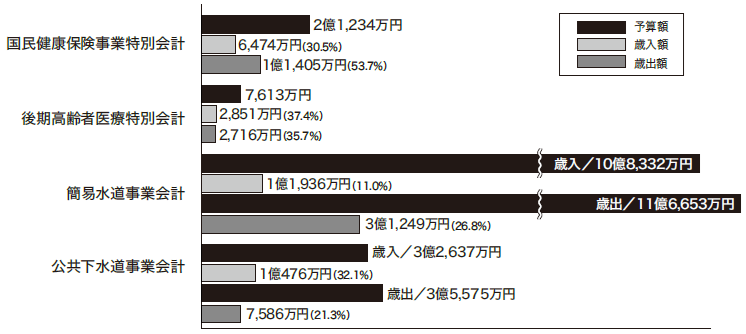 特別会計、公営企業会計では、国民健康保険や後期高齢者医療保険の安定運営のために必要な予算、安全でおいしい水の提供など、水道や下水道に必要な予算を一般会計とは別の会計として経理しています。