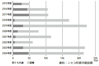 国土利用計画法の届け出対象となる1万平方メートル以上の町の土地取引の件数を左記に示します。こうした取引には、資産保有のほか、ホテルなどのリゾート開発を目的としたものも多くあります。