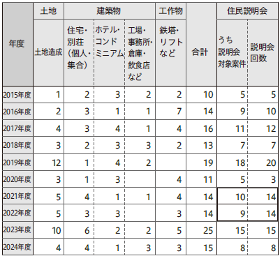 特に令和3(2021)年度〜令和4(2022)年度は、一つの案件で4〜5回の住民説明会を開催しても事業者と住民が折り合わず、町が都市計画審議会に意見を聴く事例が起こりました。