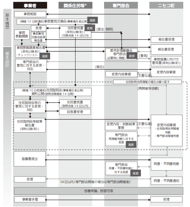 ※関係住民等…事業予定敷地に隣接する土地および建築物の所有者ならびに占有者、事業予定敷地の属する自治会の町民、事業予定敷地の自治会と隣接し、事業の影響が懸念されると町長が認めた自治会の町民、景観協定・コミュニティ協定を締結した区域の町民
