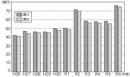 令和6年度の一般会計決算は、町税などの増加により歳入で前年度比+18億7,400万円(+32・7%)、歳出は前年度比+19億7,340万円(+36・3%)となり、歳入歳出ともに前年度から大きく増加しました。