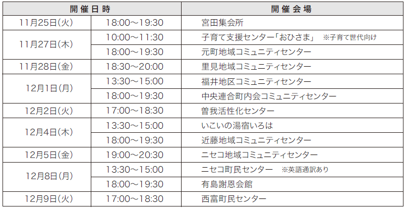 日程は、広報ニセコ『まちのカレンダー』やホームページなどをご覧ください。