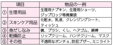 (1)防災用備品としてある程度の数量は備蓄していますが、ご自身でも準備してください。特に、生活用水の確保が不明の場合洗濯は期待できません。使い捨ての生理用ショーツも必要です。また、初潮前のこどもがいる方は、念のためこどもの分も準備するとよいでしょう。