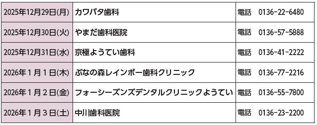 羊蹄山麓支部の年末年始の当番診療所は次のとおりです。なお、診療時間は午前9時から12時までとなっておりますので、ご注意ください。