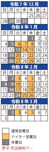 ナイター営業日:毎週火・木曜日(火・木曜日が休業の場合はその翌日)と、令和8年1月7日(水)