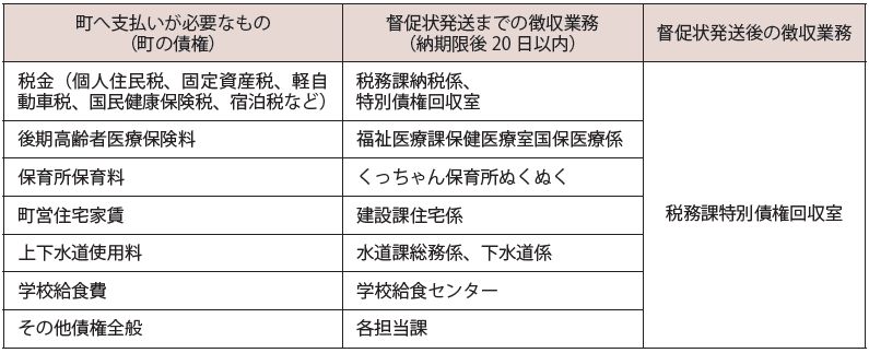 町への支払いが必要な個人住民税や後期高齢者医療保険料、保育所の保育料などに関して、現在は各担当課が未納に対する処理や納付相談などを行っています。