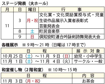 今年も、倶知安町総合文化祭を文化福祉センターで開催します。期間中は、ステージ発表や各種展示など、さまざまなイベントが行われますので、多くの皆さんのご来場をお待ちしています。