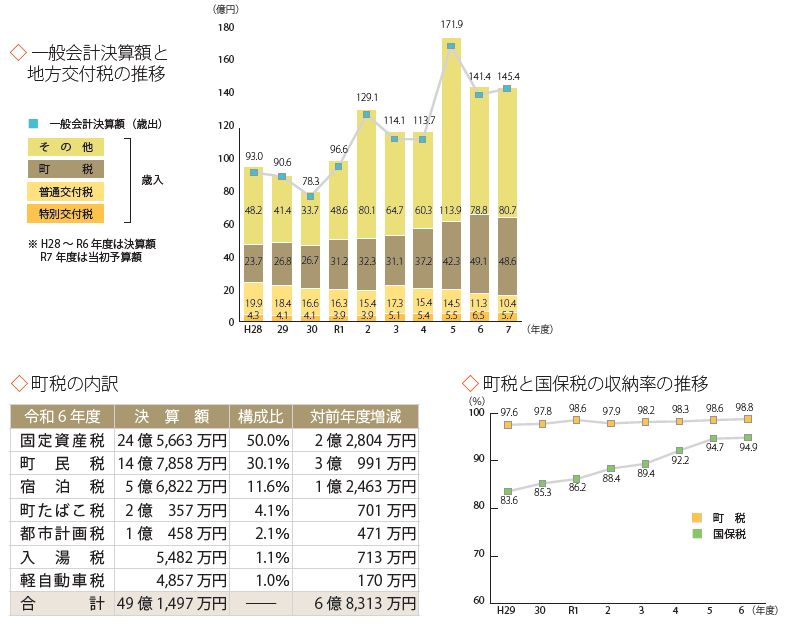 歳入の主要な柱となる町税は、昨年度から引き続き町民税と宿泊税が増加傾向にあります。さらに、固定資産税においても堅調な伸びをみせていることから、6億8,400万円の増加となりました。