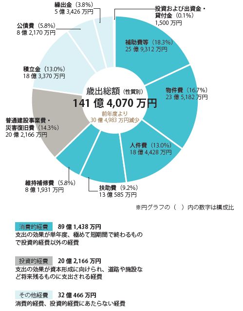 歳出総額は前年度に比べ約17.7%、30億4,983万円の減少となりました。