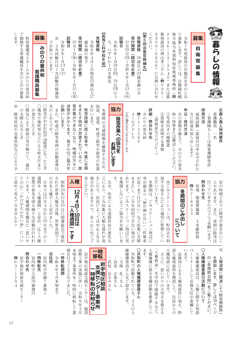 くらし 広報きょうわ 2025年12月号 P.17 17/20 前の記事 次の記事 発行日 : 2025年12月01日 自治体名 : 北海道共和町 広報紙名 : 広報きょうわ 2025年12月号(No.844) Tweet シェアする 広報きょうわ 2025年12月号 P.16 広報きょうわ 2025年12月号 P.18